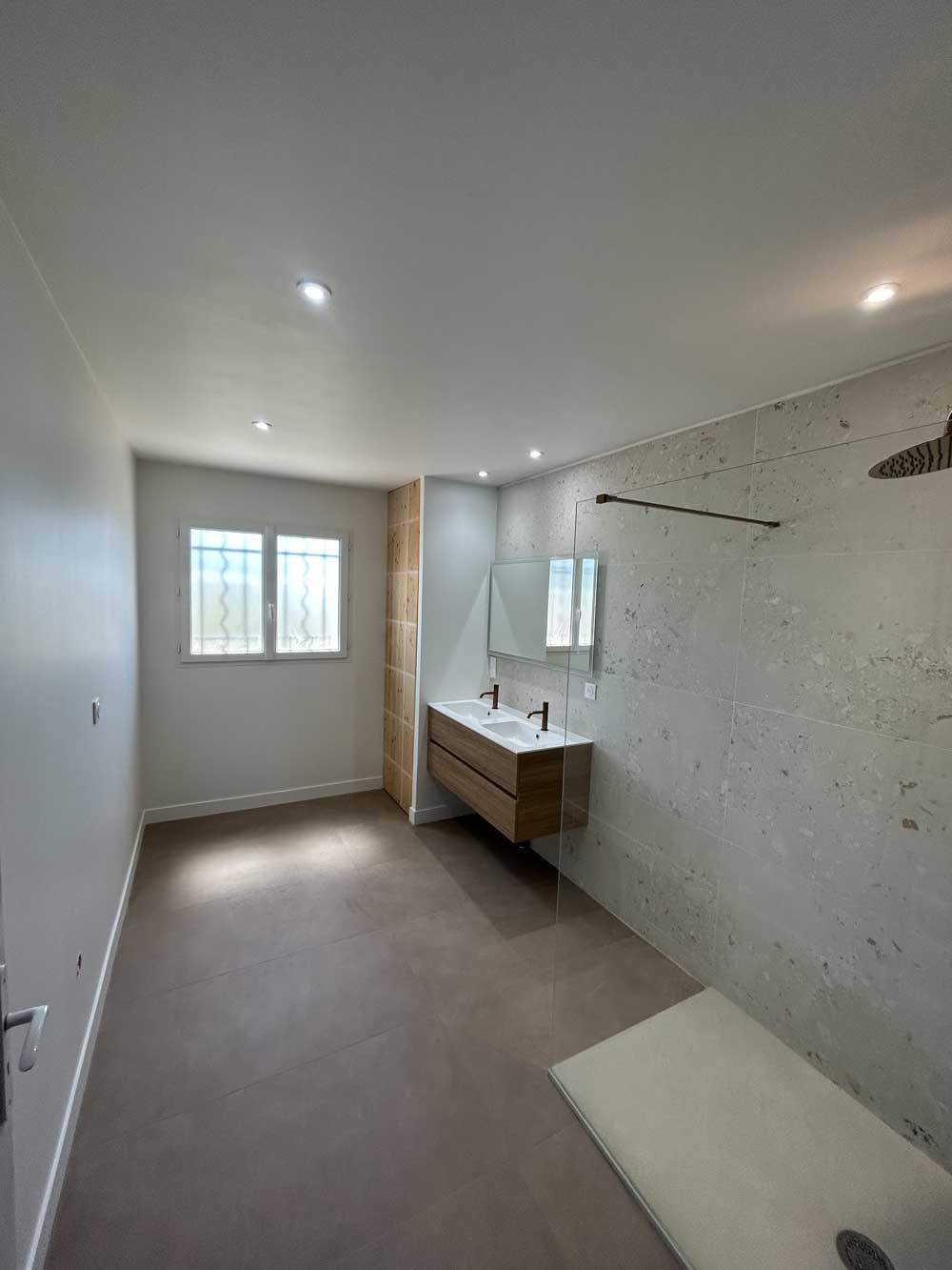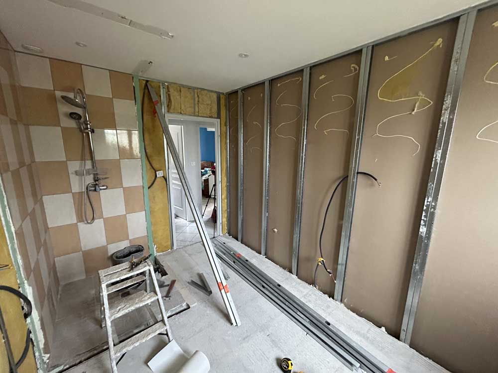 - Création d’un placard de rangement intégré, pratique pour stocker serviettes et produits de pharmacie.